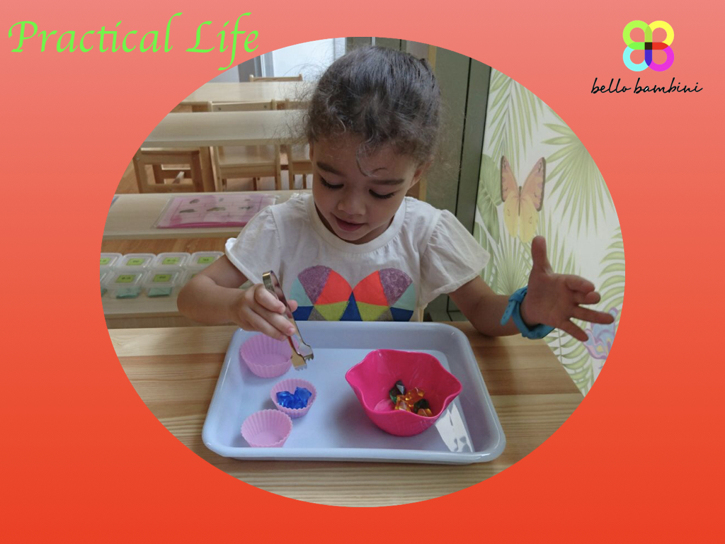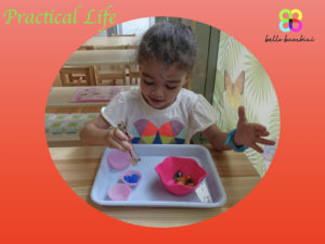 Practical Life activities are the activities of everyday life and they are involved in all aspects of life. The child observes these activities in the environment and gains knowledge through the real experience of how to accomplish life skills in a purposeful way. In addition to providing meaning for actions, these activities lead children to practice concentration, a hallmark of Montessori education. Practical Life revolve around four areas: Caring for the Self, Caring for the Environment, Grace & Courtesy and Movement of Objects.